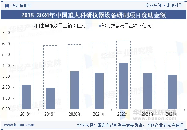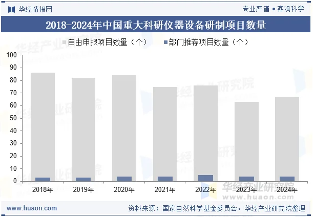 为支持我国科学事业的发展,推动我国科技发展进程,国家自2001年起成立国家自然科学基金委员会,重大科研仪器研制项目是基金资助的项目之一,包括部门推荐和自由申请两个亚类,研究期限5年。其中,部门推荐的直接费用预算在1000万元/项以上(含1000万元/项),自由申请的直接费用预算不超过1000万元/项。根据国家自然科学基金委员会披露的统计数据,2024年共有71个项目获得国家重大科研仪器研制项目(4个部门推荐,67个自由申请)。