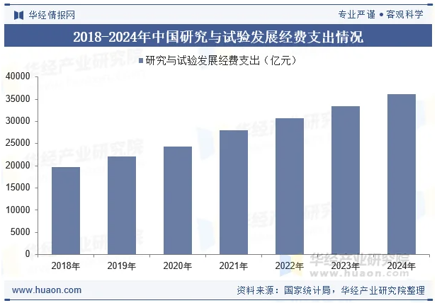 2018-2024年,我国研究与试验发展(R&D)经费支出规模逐年增长,复合增长率达到10.66%。据国家统计局数据,2024年,我国R&D经费支出36130亿元,同比增长8.3%,与国内生产总值之比为2.68%。